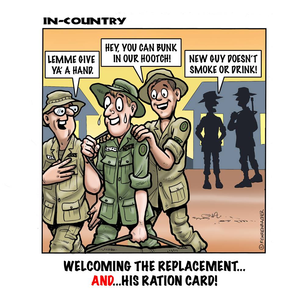 Phil enlisted in the Army in 1965 where you served for years in Vietnam.  He became a graphic designer and has worked for the state of Oregon for 26 years.  He retired in 2003 and started the Cartoon "In-Country".  The cartoons reflect his experiences during his tour of duty in South Vietnam.