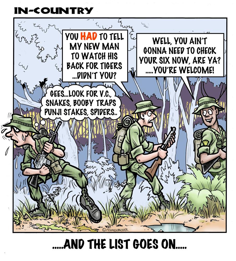 Phil enlisted in the Army in 1965 where you served for years in Vietnam. He became a graphic designer and has worked for the state of Oregon for 26 years. He retired in 2003 and started the Cartoon "In-Country". The cartoons reflect his experiences during his tour of duty in South Vietnam.