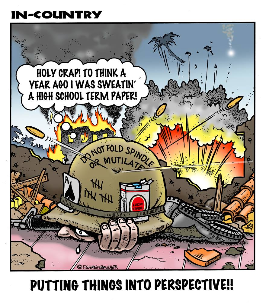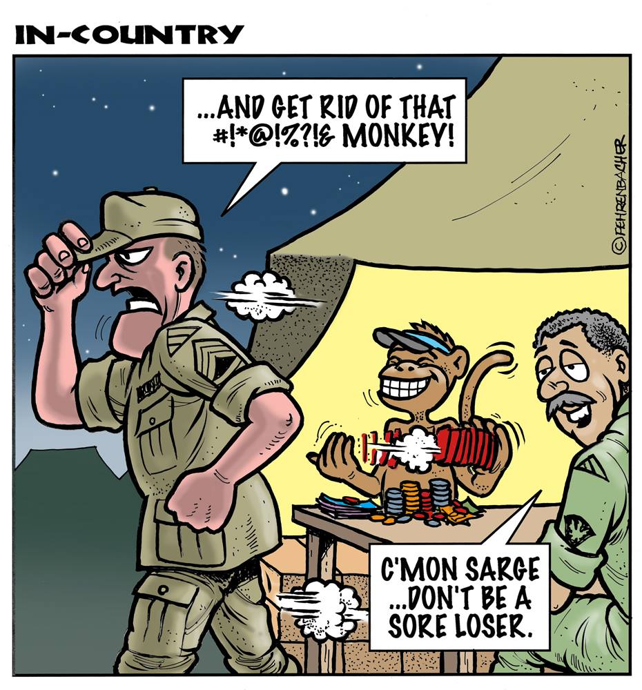 Phil enlisted in the Army in 1965 where you served for years in Vietnam.  He became a graphic designer and has worked for the state of Oregon for 26 years.  He retired in 2003 and started the Cartoon "In-Country".  The cartoons reflect his experiences during his tour of duty in South Vietnam.